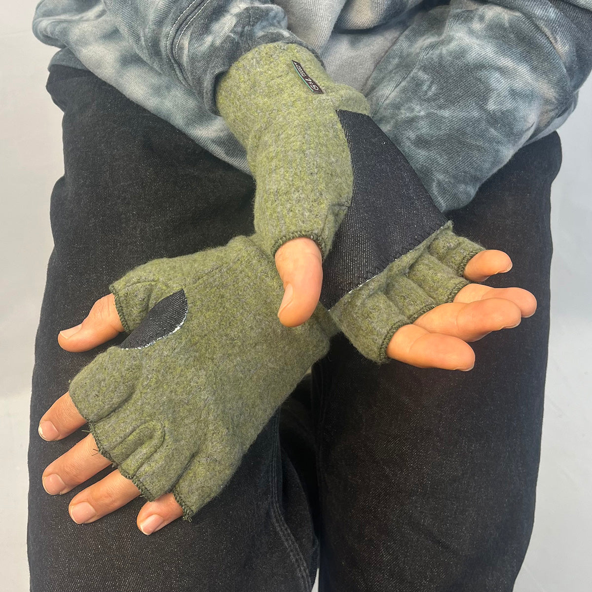 Male model styling Nomad Fingerless Gloves – sustainable fabric