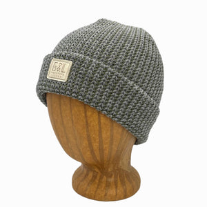 The beanie is made from recycled yarn fabric. It is a blend of 50% cotton and 50% Polylana knit fibers spun together. The 2 yarns are marled for a two-tone effect.